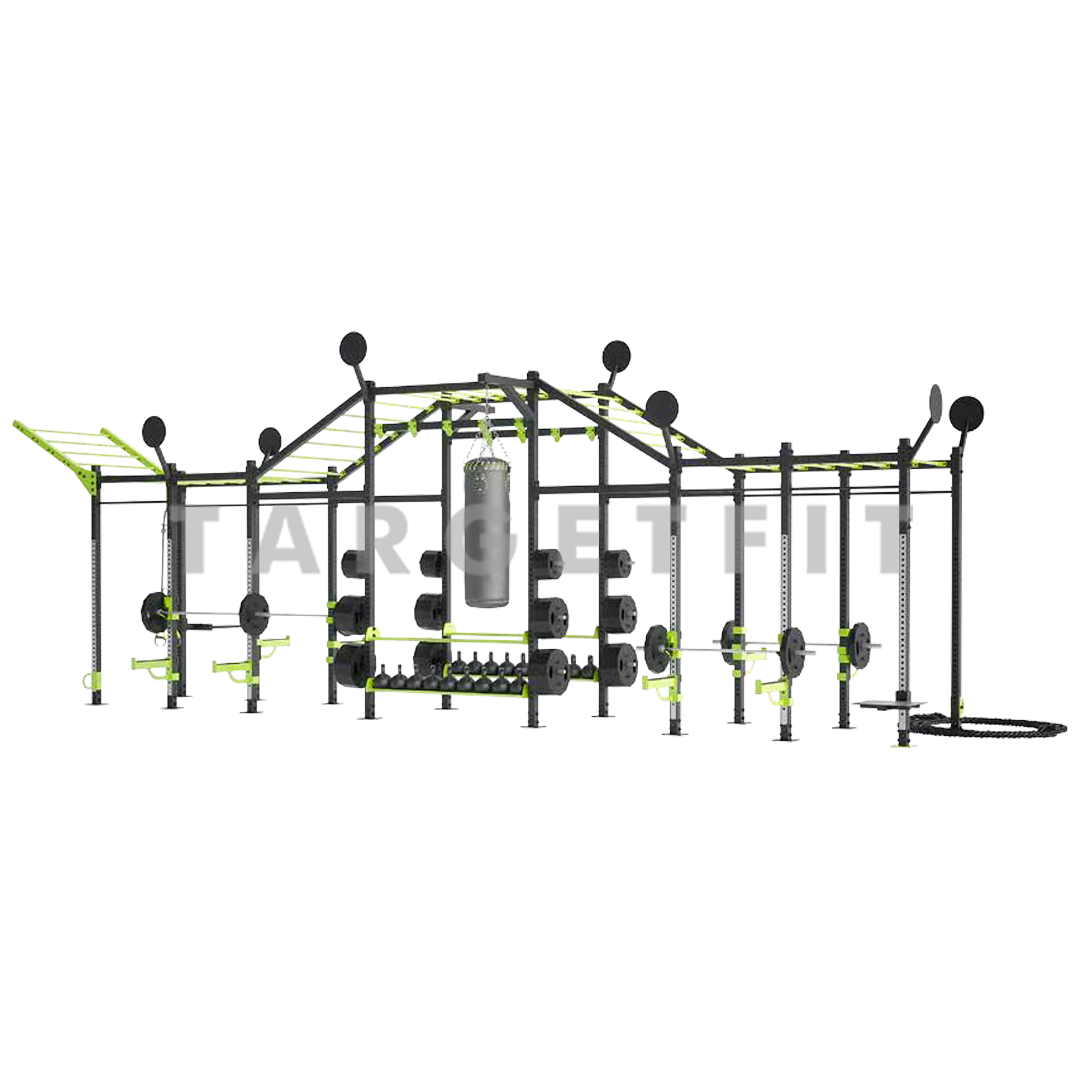 4 squat / bench stations, 10 pull-up stations, 2 box units, dip stations, boxjump platform as well as ropes and slings can be integrated into the training.